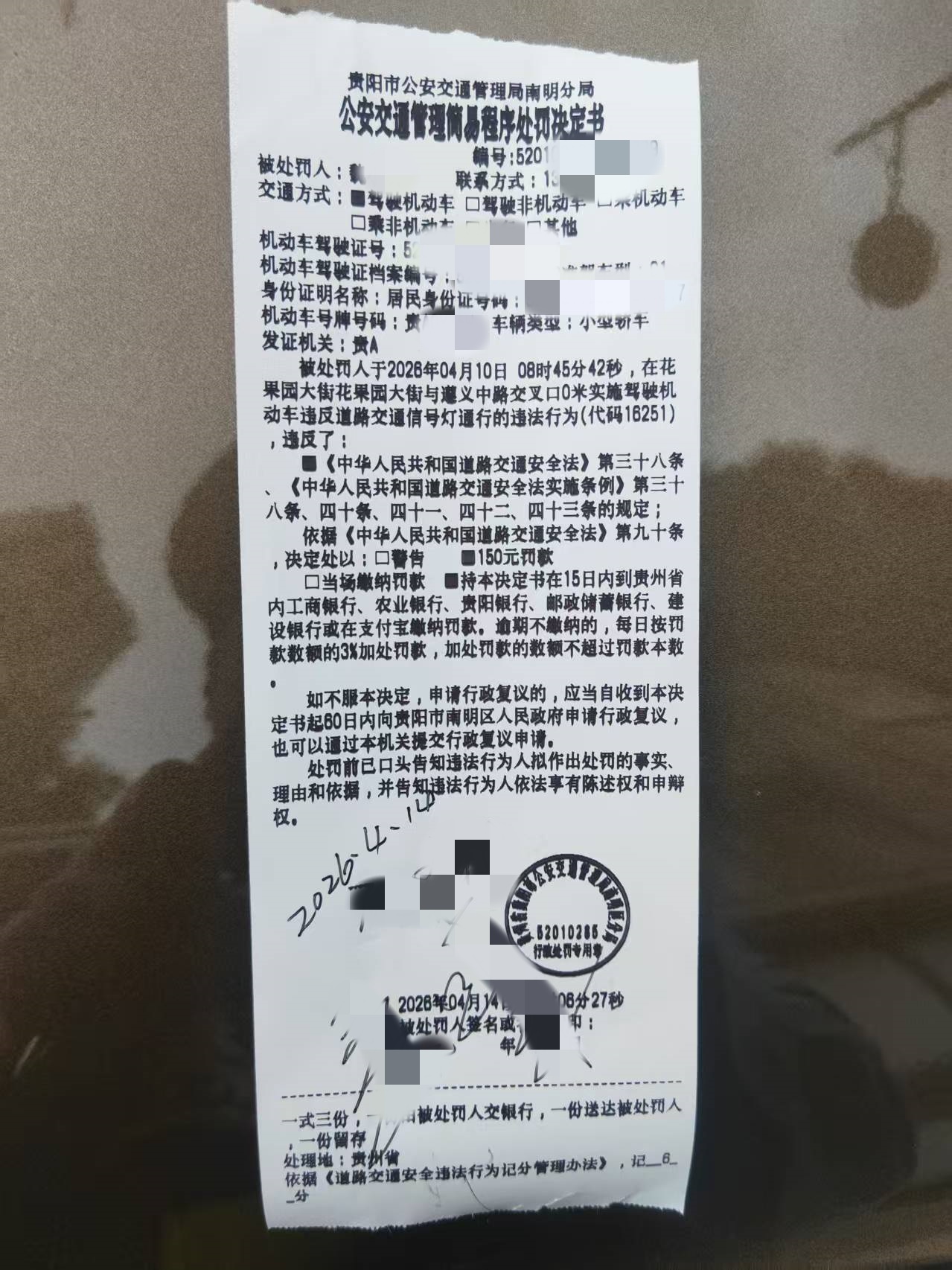 【部门回复】4月15日,贵阳市公安局交通管理支队二大队回复市民:经核查,涉事车辆存在不按交通信号灯行驶的违法行为。民警随即联系该车驾驶员到队接受处理,当事人于4月14日13时许前往花果园交警队接受处罚。根据《中华人民共和国道路交通安全法》的相关规定,对其驾驶机动车违反道路交通信号灯通行的违法行为,依法处以记6分、罚款150元,并开具简易程序处罚决定书。